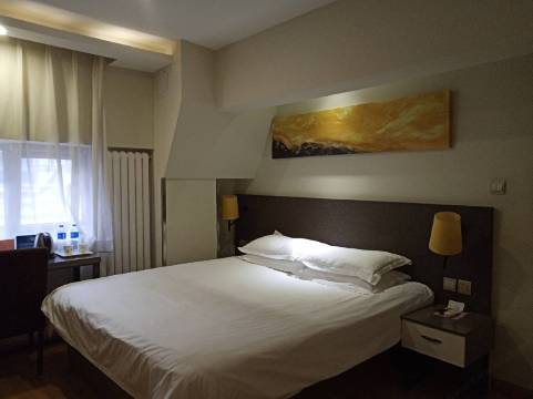 预定这里之前提前来看过,没有电梯,楼梯铺的地毯颜色特别的深了,房间在三楼,大床靠墙的窗户,过道大约30平,前面的电视柜底下塞了一个类似床头柜,房间门后面是个独立小卫生间,看见基本设施齐全就下单预定了,晚上六点左右拿行李过来,拧上三楼有点费劲儿,后面出去吃饭,回来了八点左右,准备睡觉就听见外面有类似发动机的声音,床头有类似卫生间换气扇的声音,只是比换气扇的声音稍微小一点,太累了都躺下了就没折腾工作人员忍了,凌晨五点左右床头的声音一直持续,怕打扰前台休息,七点21分拨打平台上电话,反馈让来听听到底哪里声音,后面7.25来电话告知走不开只有一个人让等到八点,就在房间等,8.42分去电话问了,为什么八点上班了一直没人来听听,这才说会叫人过来看看,是遗忘了,后面师傅来听说是没有,再到卫生间对比,发现是暖气里的声音,好在晚上累了,这个318虽然室内室外的声音都有,还是睡着了,如果睡眠质量不好的人建议谨慎选择