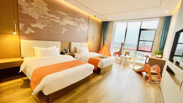 房间很大,落地窗,孩子喜欢,晚上很安静,还专门有提供儿童拖鞋和牙刷,点赞!前台和楼层都有饮水机,很方便!一个小的建议,卫生间的玻璃怎么都有点透,还是应该处理一下,另外,再增加一个毛巾架就更好了!