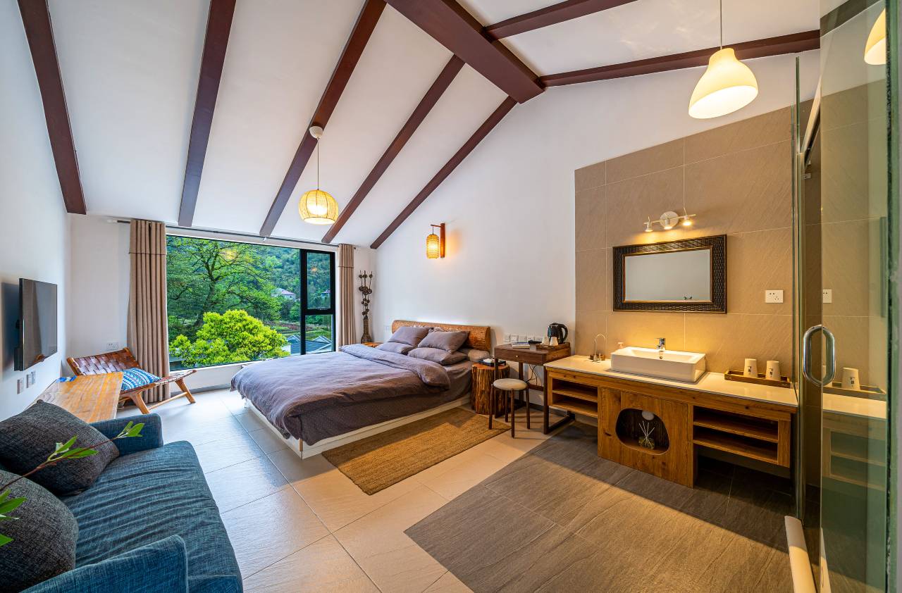 山庄依山傍水而建,木式结构的10间客房围绕着2000平米的中式院落,随着山体起伏而错落有致,门前小桥溪水,农田青葱。这里有多种客房可供选择,房内MUJI风的床品温馨且舒适,无线 WIFI让你自由网上冲浪。