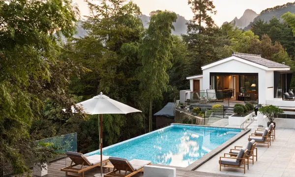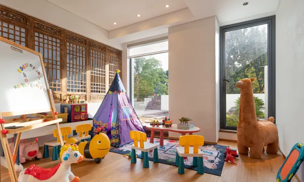 雨可欣闻云海,晴可乐瞻大佛,晨可聆鸟语蝉鸣,昏可观夕阳西下,祈福礼佛修心,度假回归自然!山景无边泳池,面朝山林竹海,返璞山景一览无余,似是山海中的蓝宝石清澈透亮,燃木真火壁炉,冬季围坐取暖,看屋外簇簇白雪,听柴火啪啪作响!禅修茶室、独立清吧供您闲暇时品一壶清茶,清幽宁静,还可以与老友叙旧小酌一杯,惬意轻松,儿童游乐区就是小朋友玩耍的天堂啦。图书绘本、安全环保玩具一应俱全。