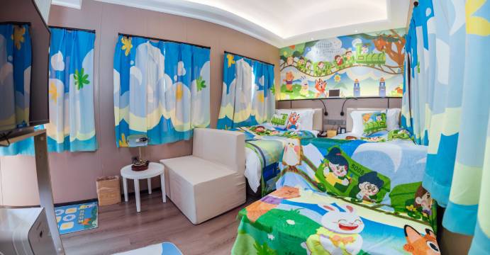 非常满意的亲子房入住体验,首先房间的布置深得娃心,送了玩具小火车、儿童专用洗漱用品、积木盲盒、扬大酸奶,还有儿童乐园喂养小动物的蔬菜。房间干净卫生,配套齐全,居然还有小冰箱,舒适度不输星级酒店。餐车还可以点菜,菜品不多但是全家皆宜。感谢小毛小柳两位美女接待提供的优质服务,还有热心肠的保洁阿姨。下次还会和娃的小伙伴一起来玩!