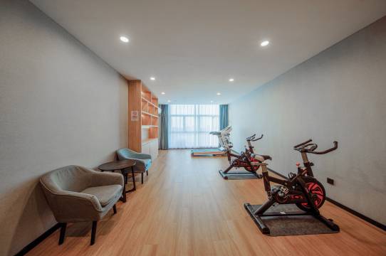 房间非常宽敞,装修也很新,晚上吃饭发现四楼还有健身房,来的时候没注意,早知道还可以上去运动运动,设施也很齐全,最主要床睡着非常舒服。办理入住的美女服务很好,办理退房时的服务员服务态度一般,这一点不如汉庭酒店 但是还是好评 好评 好评