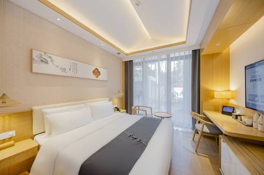 • 客房内部:布局简约温馨,床品整洁、装饰有中式书画,木质元素+柔和灯光让空间温暖舒适;大窗户/落地窗引入自然绿意,既提升了采光,也让住客能享受窗外景致,细节(如家具设计、软装搭配)都很用心。