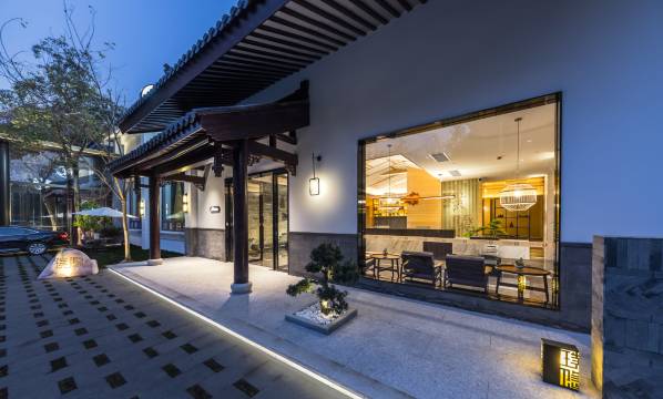 • 外部建筑:中式风格与现代设计融合(白墙黛瓦、灯光勾勒轮廓),既有传统韵味又不失精致感,夜晚视觉效果尤其雅致,门前景观(石、绿植、步道)也营造出宁静氛围。