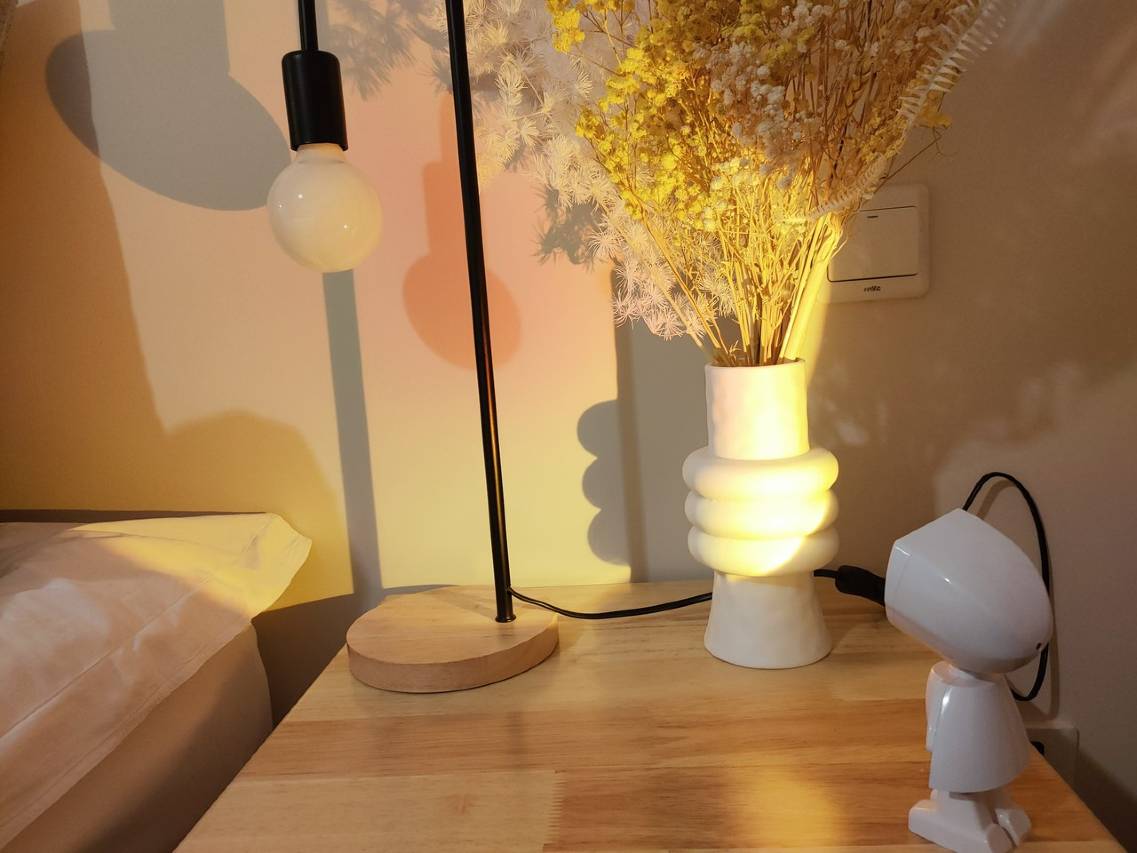 房间特别大也很干净 我特别喜欢这个装修特别特别温馨 然后投投影也超大一个 住着特别爽 除了商家给的照片里面的那些还有一个小茶桌 东西也特别齐全一次性浴巾毛巾 就是退房有点乱乱的没拍照放一个吃饭的吧