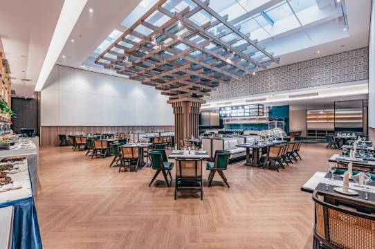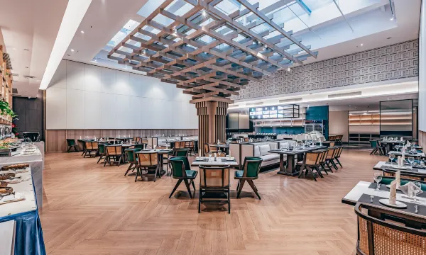 这家酒店的自助早餐和设施确实不错!现炒小菜新鲜热乎,五彩炒饭营养又好吃,甜品区的蛋糕和泡芙也很诱人。最惊喜的是送餐机器人和中式接待台,细节处处体现用心,住得舒服又安心。