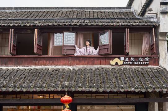 酒店前屋主刘铸为南浔“四象”之首刘镛的长兄,建筑于清代,楼厅沿街临河。临河2楼有4间大床房,白天婚穿表演,晚上投影,尽收眼帘。主楼保留原有中式古典风格,很适合亲子。房型全部带双门阳台,独享庭院美景;半露天温泉位于庭院内,与整个庭院景色浑然天成为民宿一大特色。