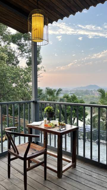 环境很棒,在一个大院里面,很安静。我们订的房间在山顶,平房,房前屋后可以休息品茶,店家还免费提供当地特产六堡茶。房间很大,一张一米八大床,一张一米三七中床,一家三口住都很宽阔。热水够大,洗得很舒服。早餐虽然款式不多,但味道还不错,贵在实惠。