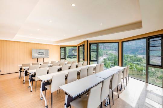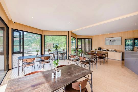 我入住的是湖景大床房,房间自带超大观景露台,视野开阔,直面太行山水美景,晨起与傍晚的景致格外治愈。美中不足的是室内空间略紧凑,卫生间布局与房车设计相似,功能性齐全但稍显局促。