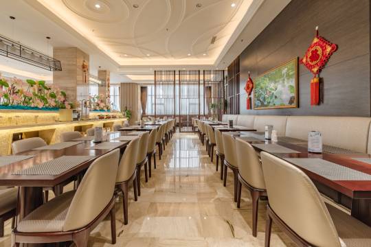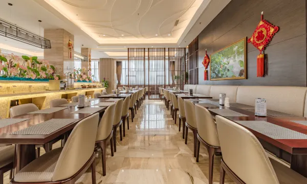 主楼东侧附属建筑为酒店餐饮中心,拥有装修风格不一的10间生态餐厅包房,为宾客提供舜耕经典鲁菜、济南传统名吃及章丘当地特色。