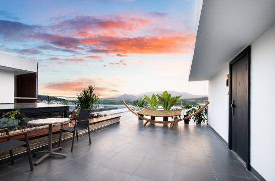还不错呢,海景房风景很美,酒店前台24小时在线,楼下走三五分钟就是海滩,,离礁石公园也就几百米,楼下还有个美食街~