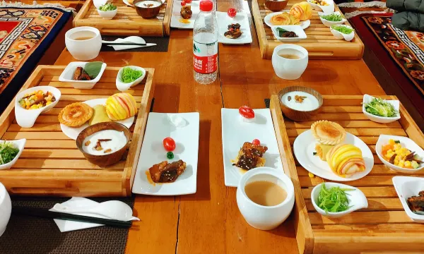 酒店位置优越,未进入县城就能看到最高的红色地标建筑,很喜欢酒店的设计风格,客房大厅有游牧文化的榻榻米,布景漂亮,卫浴干湿分离且可免费提供制氧机,高反人群的福音。酒店自营餐厅美食惊艳,早餐有奶茶和糌粑点心。