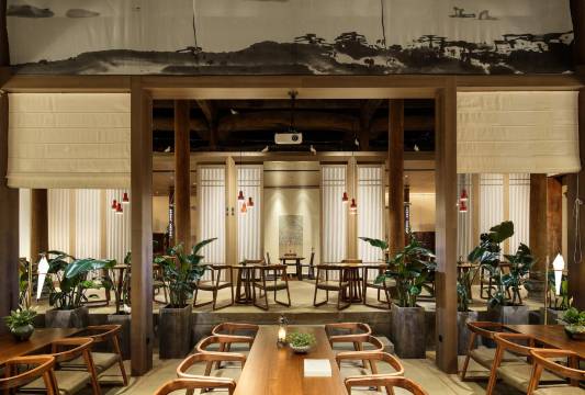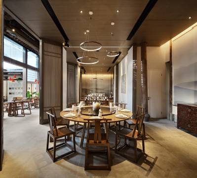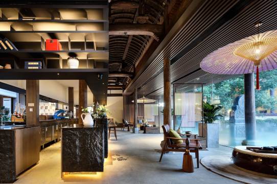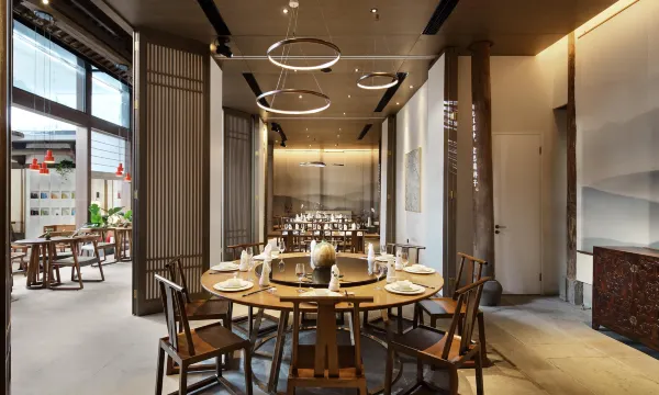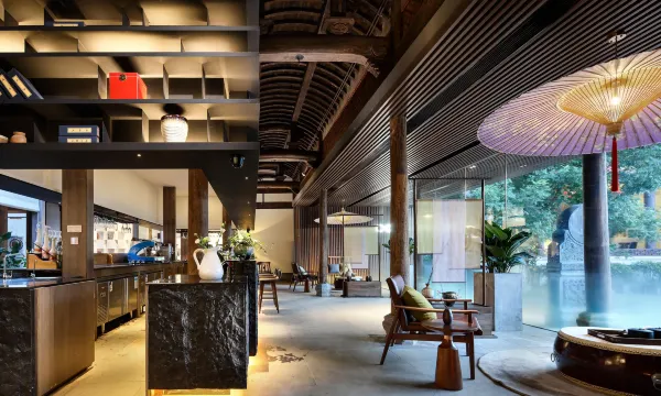 本店位于黄山市区湖边古村落,共分为3栋徽派建筑中,主楼徽戏台旁,由一栋仿古建筑改造而来。酒店由阿里巴巴的“御用设计师”朱晓鸣操刀,以徽州戏曲元素为主题进行设计。民宿分为前后两栋建筑,前面一栋是官厅,复现清代徽州官家宅第的典型之作“大埠官厅”。官厅天井,自然光倾泻,通透明亮。细节之处也尽显徽派元素,雕梁木柱、徽州大鼓、纸伞灯具。从官厅经一条古色古香的小巷进入私密的后厅。每个客房都以徽剧人物命名,花衫、老生、二花等,室内设计也根据这些角色的特质精准设置。房内卫浴使用了进口高端设备。房间窗外风景优美,新安江水绵延、古树参天,对岸古刹伫立。2号楼以16个月相为主题设计命名,3号楼以传统的“四水归堂”为主题风格。