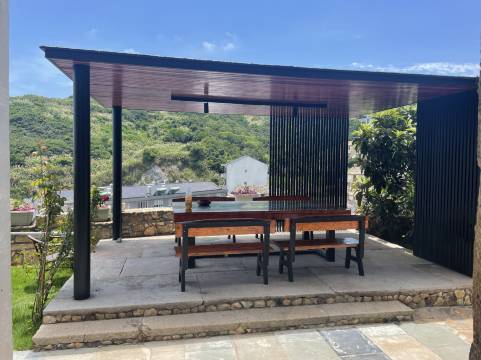 就在金沙滩对面,民宿在半山腰上,和另外一家高端民宿共享公共设施。