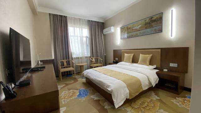 我们赶路8点半到的酒店,前台开好房间后居然按人头赠送了和硕金沙滩景区门票,还有游船和摩托车的7折优惠券,早上也有早餐,非常干净,也很安静,早上起来一看酒店绿化特别好,在新疆绿化很好是非常费钱的。几点不足,早上9点半下去没有早餐了,吃饭要乘早也许十一人多都赶着出去玩起得早😂另外房间热水器是电热的假如需要搓澡洗的时间长可能水后面不够。县城消费低出去吃饭也特别便宜。金沙滩也是海滩平替,已经决定明年夏天再来