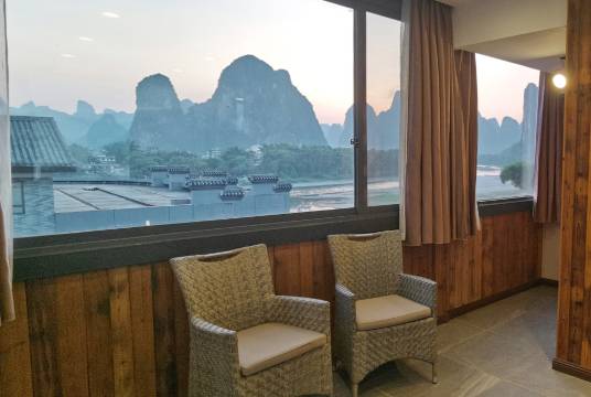 房间设计布置都很有特色,前台小姐姐很热情服务真的很好,老板还特意发了兴坪游览路线供我们参考,尤其是房间露台还能看到20元人民币背景图的风景,早上还看了日出,太棒了