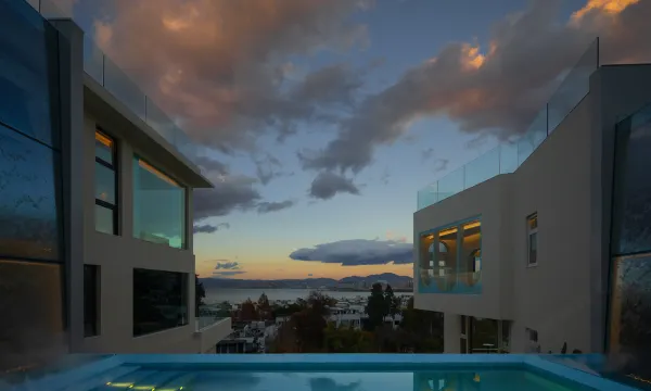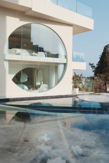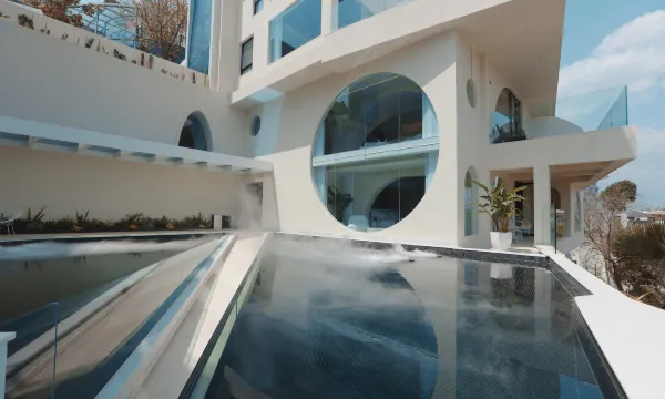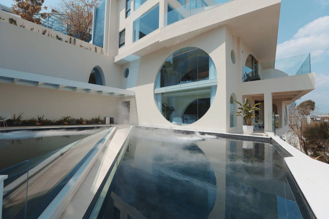 酒店,坐落于大理市中心洱海之畔的团山公园洱海天域别墅区半山,以《千里江山图》为蓝本,由著名设计师事务所“寻常设计”主理人林经锐先生亲自设计,孕育出洱海湖畔,坐望苍山的酒店,远处烟波浩渺,层峦起伏,山峦下流水滔滔,村落房屋错落,山水画卷之间,是我们内心深处对理想居住环境的愿景。简约大气的蓝白色无边泳池,纯白的旋转楼梯和拱门台阶,极具私密性的超大恒温泡池,用水景造就流光溢彩的洞穴星空顶,中西式融合的浪漫氛围从建筑延伸至室内,试问,谁能拒绝一个拥有270度海景景观的宝石绿玻璃浴缸…… 酒店由两栋独立的四层别墅组成,包含餐厅、会议室、咖啡厅、健身房、户外超大型全海景水台,已举办近千起各种风格/类型的户外婚礼、品牌活动。