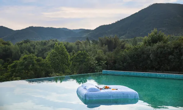 阳台直面泳池山景,治愈感拉满!设施新,大堂中式风很大气,早餐品种多还清净,加分!