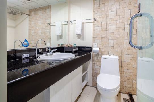 7、厕所很大!而且基本的比如说一次性牙刷梳子也有,但是不同的是提供了一次性马桶垫(这是一些酒店所没有的,而且是那种套圈的很舒服),洗手台设计也很用心,热水和冷水的旋转方向有贴贴纸方便客人使用,且洗手台放置有风油精(上面还插了一朵花),既美观又除异味。洗澡也特别好还提供了一次性沐浴露和洗发水就很安心。