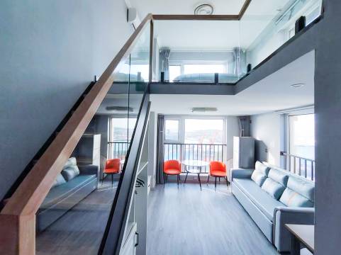 本间loft上层有一大一小两张床,下层客厅里还有一张伸缩沙发床,极限可住5人。空间利用率高。
