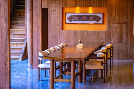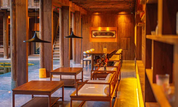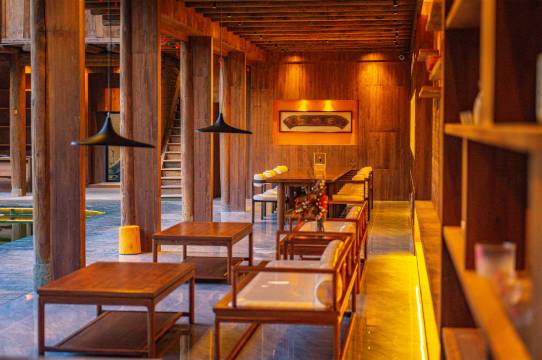 升恒楼世遗民宿为土楼改造而成的高端网红民宿,位于世界文化遗产、国家5A级旅游景区的福建土楼客家民俗文化村景区内,这里的土楼以土楼结构最精巧、形式多样、内涵丰富而著称,是福建土楼建筑的杰出代表。升恒楼总占地面积5.2亩,其布置融合了客家耕读文化与现代艺术,充满古朴气息又不失时尚感,传统农耕器具的布置,让游客切身体验到浓厚的乡村文化,记起“乡愁”;在土楼中厅使用水为主要设计元素,水中倒影出民宿的轮廓,若隐若现,让民宿更加清新宁静。一楼设置了茶厅、禅修室、休息厅、非遗体验等公共空间,二、三层为客房。房间保留了裸露的墙面,使住客能亲手触碰到原本的建筑肌理,也更是保留了土楼冬暖夏凉的建筑智慧。14个高端房间中卧室、起居室、书房等房间之间不设实墙,使用织物帘、置物架、屏风等轻质通透物件稍微隔开,空间开放通透。