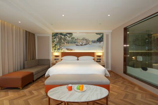 82间各式客房配有落地窗,智能化语音操控系统,为客户提供温馨、舒适、安全、科技感的住宿环境,拥有助眠愉梦之床,简欧风格设施,三秒出热水雨淋花洒,光纤网络WIFI全覆盖,丰盛触动味蕾的自助早餐,酒店并且配有免费地下停车场。