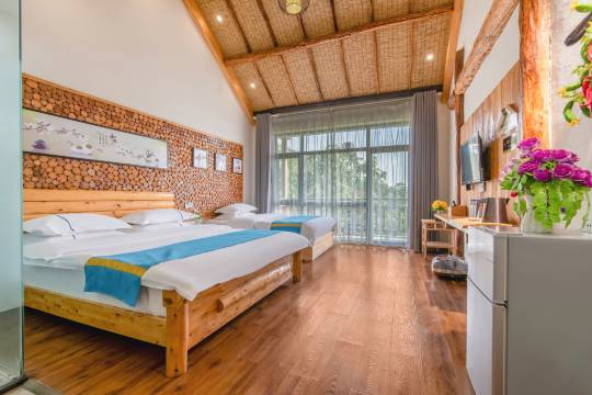 房间超大,有阳台和吊篮椅,看山看景非常惬意,虽然我住的房间邻着路,除了白天有疯狂的大巴往万善寺狂奔,晚上也是一片寂静,根本不影响睡眠。一定要夸的老板家,每次我们下山,都主动送我们到小吃街,回来也是一句话,就立刻过来接我们。要说有什么缺点就是我住的房间门缝有点太大了,走廊有个什么动静,屋里听得门清,希望老板有空修下门啊!还有就是电视机忒小,有20寸吗?看着费眼,不过每天都是去山里玩,也没多少时间窝在屋里看电视。夸下淋浴间,是独立的储水式电热水器,花洒也是超酷的有顶喷侧喷和手持花洒,一个也不少,拧开就有热水,不像别的酒店要流半天水才能出热水,好浪费。最后再说句,我们续住了两天,第二天和老板说让打扫下房间,结果晚上回来,除了垃圾桶倒了,洗漱用品补充了,地面,床铺,都没打扫,卫生间地上都是头发,也许因为地砖是仿木纹的,看不明显,做卫生的姐姐可能觉得没必要吧。以前没住过民宿,酒店都是全部打扫更换,每天回来时都是全新的,也许这就是酒店和民宿的差别吧。综上所述,性价很高,下次来还住这家!