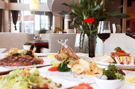 酒店餐饮部设有特色餐厅、贵宾房、宴会厅等不同风味的餐饮场所,就餐总座位数1700余位。可接待近千人的大型宴会,中型的贵宾宴会和小型家庭宴会。开放式的自助餐厅和独立的单间包房 ,带您享遍各色美食,细心周到的服务,为您提供舒适的就餐环境。