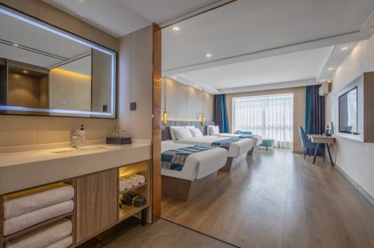 酒店设有标准间、情侣房、商务房、家庭房、榻榻米等多种房型,可满足不同客人的出行需求。房间环境优雅、温馨、视野开阔,实现全屋语音控制(如灯光、窗帘、电视更换频道、空调温度等),配有智能马桶,梦百合品牌零压床垫,零压枕,提供24小时热水、独立百兆光纤等设施,房间内科技感十足,舒适的入住条件和周到、贴心的服务是您商旅度假的理想选择。