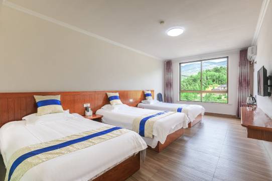 定的三人间三张1.2的床,一家四口住很舒适,老板做饭好吃,还有棋牌室可以玩,周边环境幽雅,晚上散步到旁边的灯光桥夜景好漂亮。民宿距离公主山漂流很近。