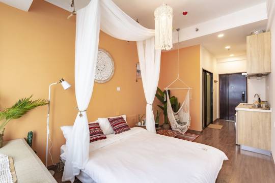 嗨,感谢您入住本小舍!本舍是房东小姐姐本人精心布置的,这里有整洁的生活用品、舒适的双人床、休闲吊椅、观景飘窗供您使用,还有高清的投影仪和生机勃勃的绿植哦,希望能带给您家一样的温暖!