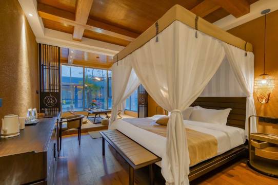 首先声明,本人不是托,带着女儿入住两晚,由衷地赞这里的环境。我觉得有一定生活阅历并且想要寻一份内心宁静的人真的应该试一试这里。除了住宿,还和女儿游览房间后面的“私家园林”,那种安静、安逸,深深刻在我的脑海,像是回到小时候在田野自由嬉戏奔跑。进房第一眼,窗外美景就映入眼帘,我甚至不由自主拿起书,在窗边榻榻米上静静看了起来,多少年没有过的“心”定,居然在这里寻到了,除了庆幸,甚至还有些感动。期间,尝试了中医推拿,做完之后浑身舒适,师傅甚至治好了我长期脖颈肌肉僵硬,所以我连续尝试了两次全身整骨。酒店的洗漱用品都是中医亲调,非常喜欢,离店时我甚至带走了房间的洗发水、护发素和沐浴露😄。房间有准备泡澡中药包,我连续两天都泡了,除湿效果一流,因此离店时我单独买了十包带走。本人住的离这里不到两小时车程,我还会来的,会常来,冲这里的宁静、安逸以及走到我心里去的“景”。