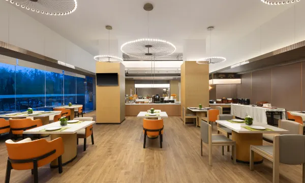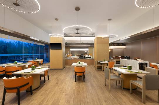 酒店配有室内餐厅,提供中西式营养早餐,同时拥有一个临湖露天风情餐厅,清晨,迎霞光万丈;日间,观碧水云天;黄昏,看夕阳西下;夜晚,赏灯火阑珊。