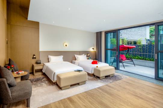 酒店定位轻奢,设计风格实现了传统院落与现代景观的完美融合,彰显了自然与人文环境,再现了峨眉山脚下独特小江南院落的沉浸式体验感。酒店倾力打造的主力房型“一房一院一私汤”:超大私汤泡池匿于独立庭院中,带您体验“水天清话,院静人销夏,蜡烛风摇帘不下,竹影半墙如画”的清幽惬意,每间房均配有先进的智能客控系统、品牌寝具、高端洗护用品、星巴克胶囊咖啡、专属管家服务。