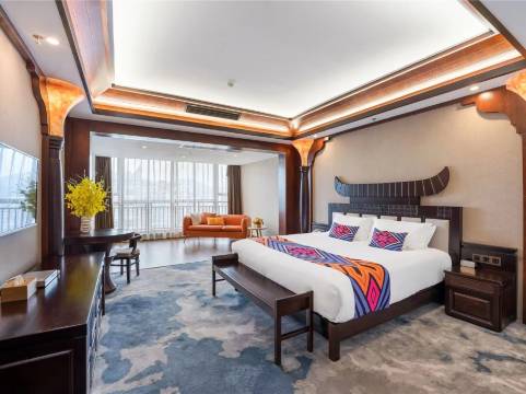 酒店客房由知名设计师精心打造;设计延续壮族元素:风鸟和铜鼓;大堂利用精细打造的玉石、浓厚名族特色的铜制灯饰、原生态的红木原木等元素营造出瑰丽华贵气质,客房硬件设备齐全,拥有百余间宽敞舒适的客房和套房,客房相当宽敞平均面积达60平方米,套房面积达130平方米,而且视野极佳,不离酒店繁华的商业街景,每间客房均配备43寸LED纯平电视及网络设备,舒适加厚记忆床垫,床高60公分,梦幻般的睡梦感。