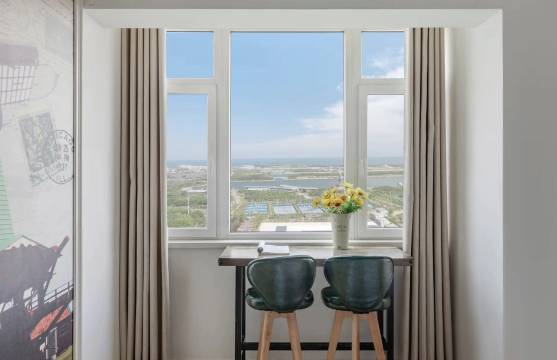 来海边玩沙子,万达广场马路对面,去哪里都方便,看了几家民宿,最后选择了这家公寓,价格肯定比偏僻地方贵,出来玩最主要的不就是少浪费时间嘛,这家公寓在市区这个价格很实惠了,房间也宽敞,比千八百的连锁酒店简直就是平民价。早上五点左右能看日出,晚上还可以看烟花,省下海之秀门票了,老板不厌其烦的回答我的问题哈,非常热情,好客日照!窗外的风景让人陶醉,海景万平口和东夷小镇一览无余,能看到标志性的万平口大桥,不过是远景大桥,楼下除了有万达还有网球场呢,整体太方便了!推荐旅游!