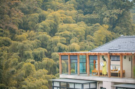 民宿米色外墙、玻璃屋顶、透明阳台……翠竹掩隐下的玻璃房,座落于安吉天荒坪与杭州临安交界,一个名为“龙池塘”的山谷中,因为一片梯田式的山谷、一条穿流而过的山溪,诞生了一座生于景,而融于景的度假民宿——云端·溪谷私汤美宿。