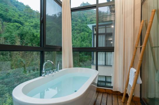 一路上公路弯弯绕绕,但是风景很好,民宿正对山谷,视野开阔,周围是大片的绿色竹海, 环境极其舒适,房间也很干净,有大浴缸可以泡澡,刷牙的时候还感觉水甜甜的,冰冰的,一问老板原来房间里引用的是山泉水,感觉太好了,提供的早餐也丰富,是很惬意的一次入住体验。