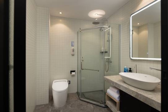 酒店配有中央净水、洗手间智能玻璃、栀子豪华单间+功夫茶、顾家床垫、栀子决明子枕+天然乳胶枕、智能扫码咖啡、床头迷你小音箱、二面针洗浴用品、无印染床品。