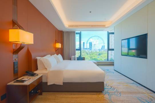 住了2天很满意,老牌酒店新装修过很好!出门打车也方便!性价比非常高!房间空间挺大的,装修简约大方,房间很明亮,住着舒服。卫生也干净。酒店服务也不错,前台小杨和小姚态度好。早餐不错,很丰富!酒店旁边有个公园有摩天轮,遛娃很不错。非常值得推荐的一家酒店!