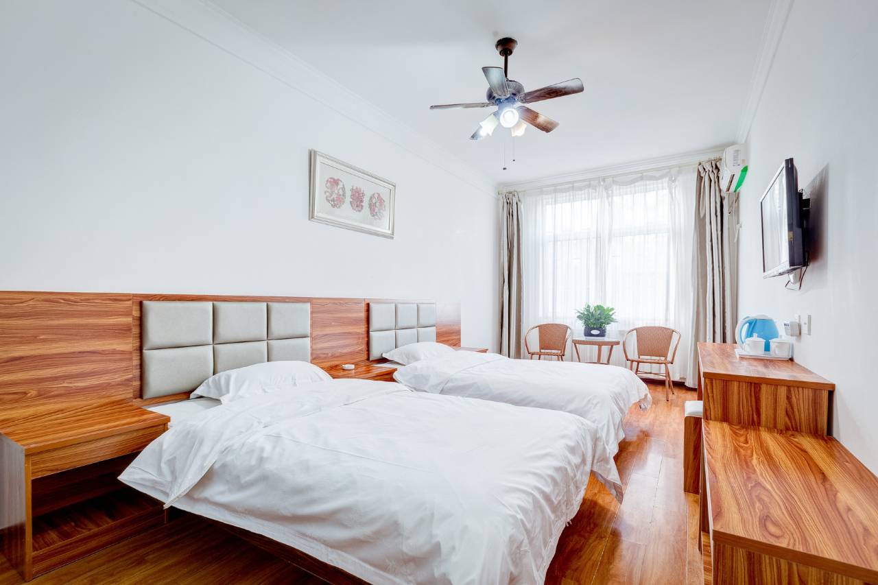 酒店客房明亮干净,设施齐全,加厚床垫配合高织数贡缎加密全棉布草。零压力床品,让您住得放心,睡得舒心。