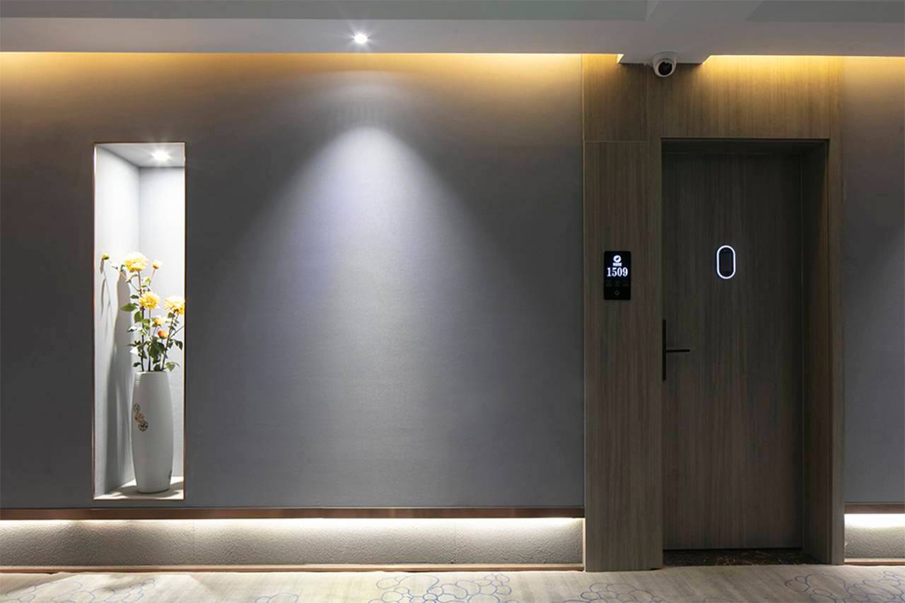 宾馆是一家集客房、会议室及餐饮于一体的综合性新型智慧酒店,引进高科技人脸识别系统,可自助办理入住、退房,智能门锁,智能梯控,实现“0”秒入住体验,刷脸乘梯、开房门和用餐。