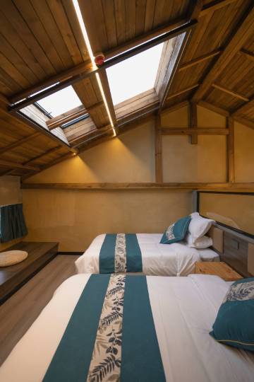 套房,有阁楼,阁楼有两张床,一楼有一张床,房间无异味,空调很足,无噪音马桶,淋浴很干净。窗帘遮光性强。全屋智能控制,灯,电视,空调都可以通过小度控制。体验很好