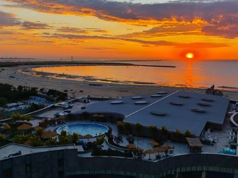 从海边向回望,可以清楚地看到大楼。海滩日落真的很美。
