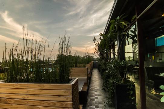 酒店顶楼餐厅环境优美,还能欣赏到泳池美景,别具一格。食物美味可口,服务周到热情。