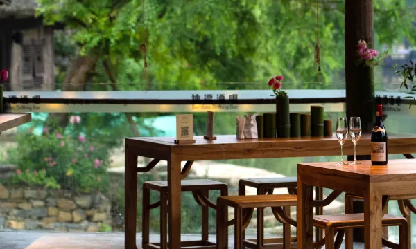 盐帮客栈位于美食街中段,以十八帮中的盐帮为主题打造,民宿内部设计极具乡野气息,不论是竹编稻草的吊灯亦或是木纹家具都将宿客带离城市的繁重琐碎,重回乡野田园。盐帮客栈层高四层,均临水面向梯田带有阳台,视野广阔,不用出门就能欣赏每晚的乌江星音乐水舞秀,是景区内景观上好的民宿之一。客栈装饰以盐帮粗犷的美学为背景,整体色调为棕色,从房间家具布置到墙面挂饰,都还原了那个时代的盐帮记忆,例如说盐帮很有代表性的背篓被设计成为灯具,而这个稻草设计的墙面挂饰是还原了旧时垫在背篓里面的“盐草”和装盐的麻袋、麻绳,每个细节都体现着盐帮特色,极具代入感。