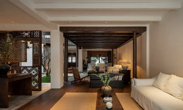 客房里深色木质护墙板搭配传统花格窗,既有古宅的沉静韵味,又不失现代舒适感。柔软的榻几旁,一盏哑光黑陶瓷台灯暖光氤氲,让人卸下旅途疲惫。卫浴区的鎏金边框镜子与黑金水龙头,更是在细节处彰显品质。