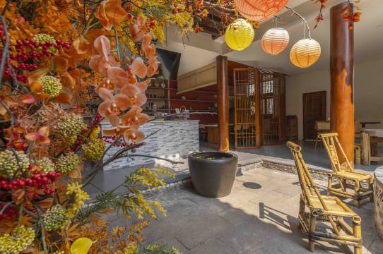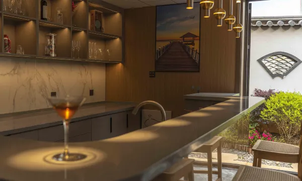 酒店介绍: 柒心居酒店建筑占地面积1050㎡,环境清雅,空间选择多样,主题活动丰富。其中一层设有中餐厅三间、西餐厅一间、茶室一间;二层设有客房十二间、茶室一间、专属餐厅一间。提供餐饮住宿、品茗、棋牌、烧烤、KTV、亲子游戏等服务项目,是举办家庭欢聚、私人庆典、商务宴请、公司团建的理想场所。
