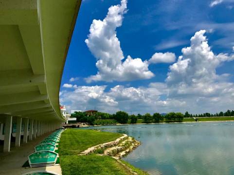 不仅适合商务还很适合亲子的一个好地方。早上起来可以跑个步,跑到山水龙泉宫1.7公里,来回3.5公里。跑完可以在房间里泡个温泉澡,然后吃个早饭在带孩子观光车游览球场一圈,最后到河边学习下挥杆。