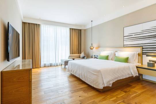 地处滨海新区,很安静。旁边就是湖,风景优美,跑步很方便。床品没得说,非常舒适。早餐超出想象,不是那种豪横的,但基本上要的都有。服务员态度都和和蔼。健身房不错,停车方便。